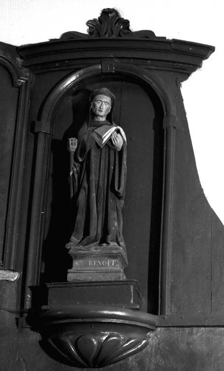 Statue d'une abbesse bénédictine, vénérée sous le nom de saint Benoît, portant le costume bénédictin, avec un voile sur la tête.