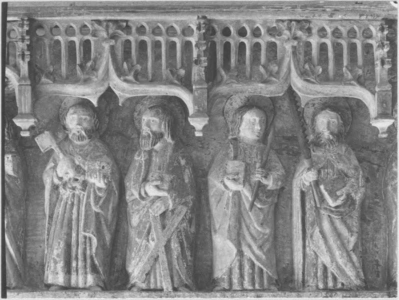 sculpture : le Christ en croix entouré de la Vierge et des apôtres