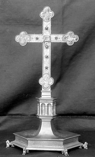 Monté sur un piédestal gothique, le crucifix a les extrémités qui se terminent en fleuron dont la décoration, en émail limousin, porte la figuration des animaux symbolisant les Evangélistes. Les reliques sont enfermées dans une ampoule placée au point d'intersection des branches de la croix. Cinq pierres précieuses, émeraudes et rubis, ornent les branches. Le revers est semblable, sauf les cabochons et les émaux.