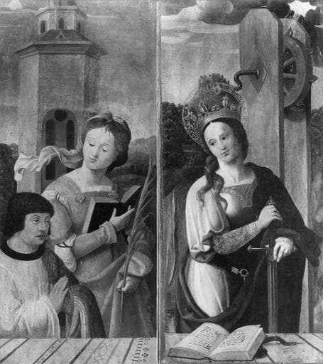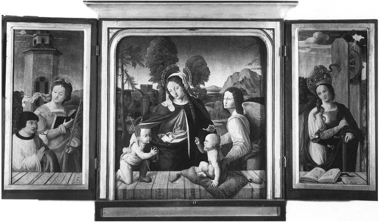 tableau (triptyque) : la Vierge à l'Enfant avec saint Jean-Baptiste, Sainte Barbe, Sainte Catherine, l'Annonciation