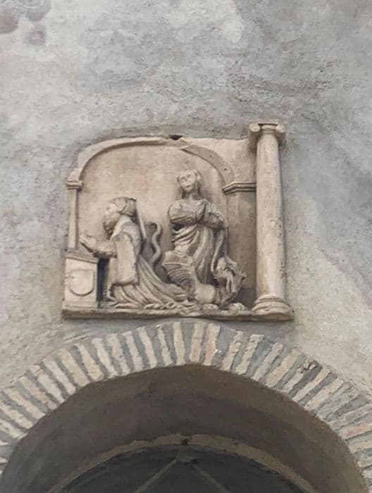 bas-relief : Dame noble agenouillée sur un prie-Dieu assistée de sainte Marguerite