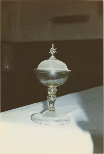 Coupe et couvercle forment une sphère légèrement aplatie en haut et en bas. En haut du couvercle, une croix (modèle de l'Ordre du Saint-Esprit). Tige : bague et poire renversée alternant avec bagues. Pied : profil en doucine.