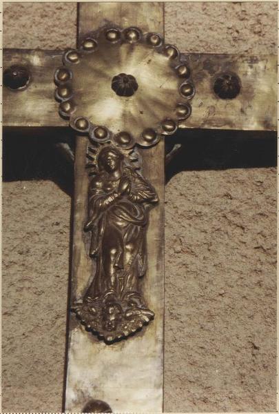 Cette croix de procession présente une hampe fleurdelysée en cinq éléments et un noeud à godrons. Des plaques figurant les évangélistes sont fixées sur les bras et sous l'arbre. Une statuette de la Vierge se trouve au dos. L'objet présente différents éléments ressoudés et de nombreux manques.