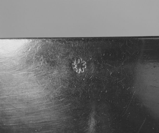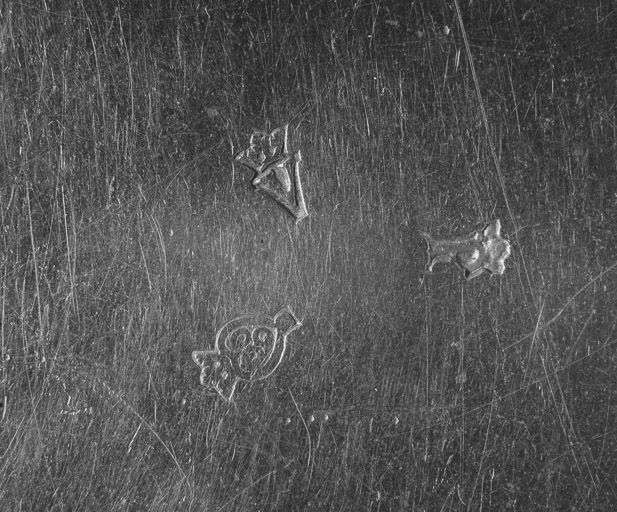 Poinçon de maître (sous le fond et les oreilles) : Gabriel François DUPONT (écu en forme de coeur couronné aux trois annelets, lettre D dessous) ; poinçon de communauté (sous le fond) : Chalon, 1773-74 (lettre V couronnée) ; poinçon de charge (sous le fond) : Chalon, 1750-74 (lettre P couronnée) ; poinçon de décharge (sur le bord) : Chalon, 1768-74 (une croix de Malte ?) ; inscription gravée sous le bord : HOPITAL.