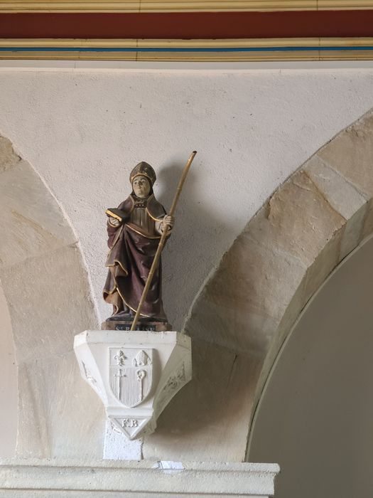 Le saint est représenté en évêque, coiffé d'une mitre et tenant la crosse et un livre à la main.
