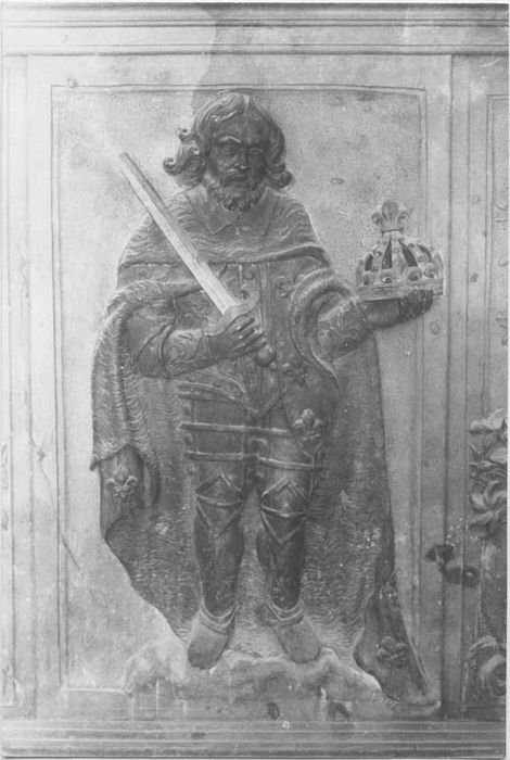 Le retable est décoré de trois compartiments rectangulaires : Charlemagne est représenté dans le compartiment central (vêtu d'une armure, tenant épée et couronne à la main). Il est encadré de deux putti portant un panier de fleurs sur leur tête.