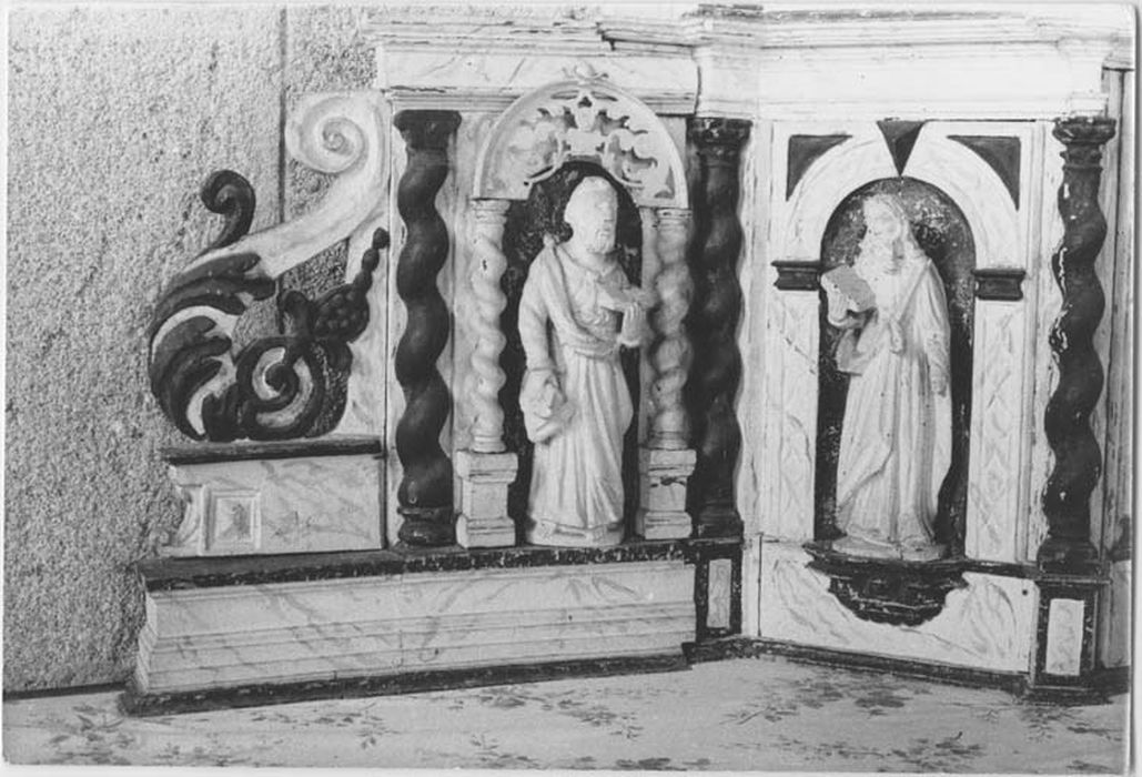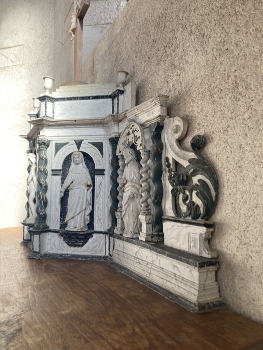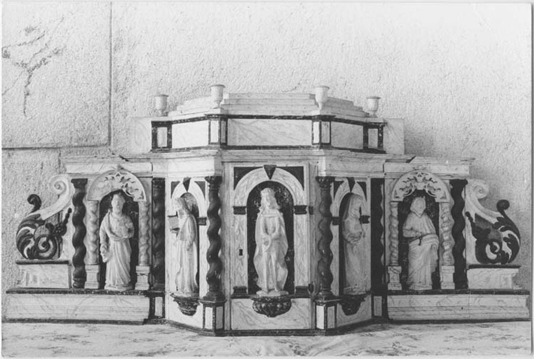 Le tabernacle est décoré dans sa partie basse de cinq statuettes abritées dans des niches. La niche centrale abrite un Ecce Homo. Il est encadré, à droite de la Vierge et saint Pierre, et à gauche de deux saints identifiés comme saint Paul et saint Jean.