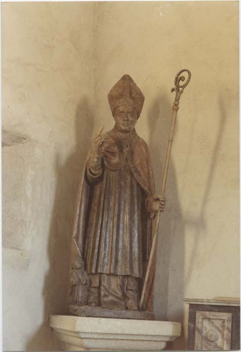 Saint Claude est représenté en évêque, coiffé de la mitre et faisant le geste de la bénédiction. A ses pieds, un enfant.
