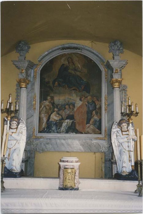 Tableau et encadrement en bois sculpté et peint en faux-marbre formant retable.