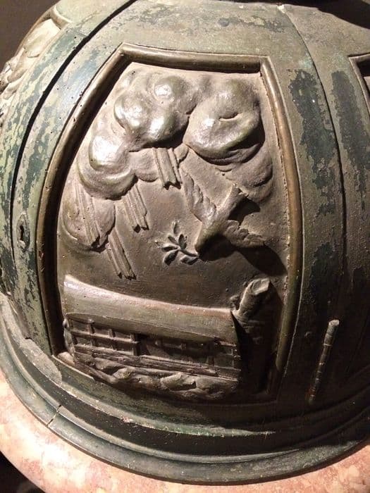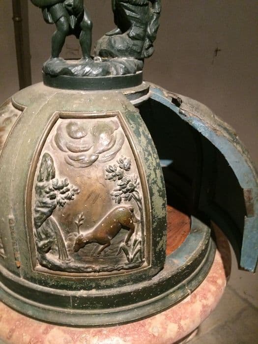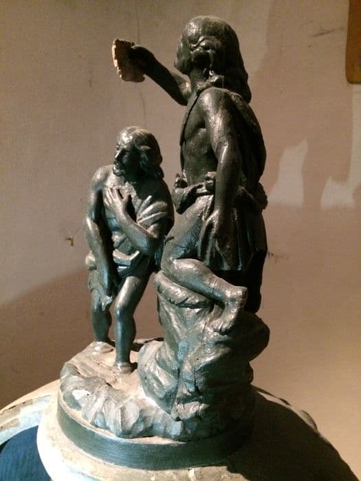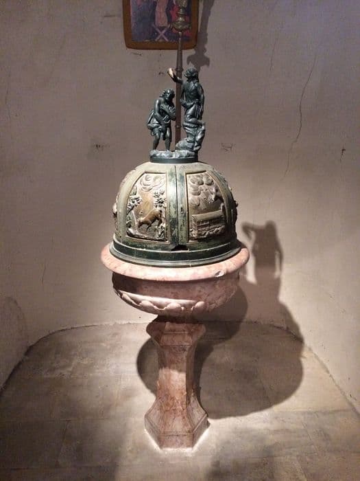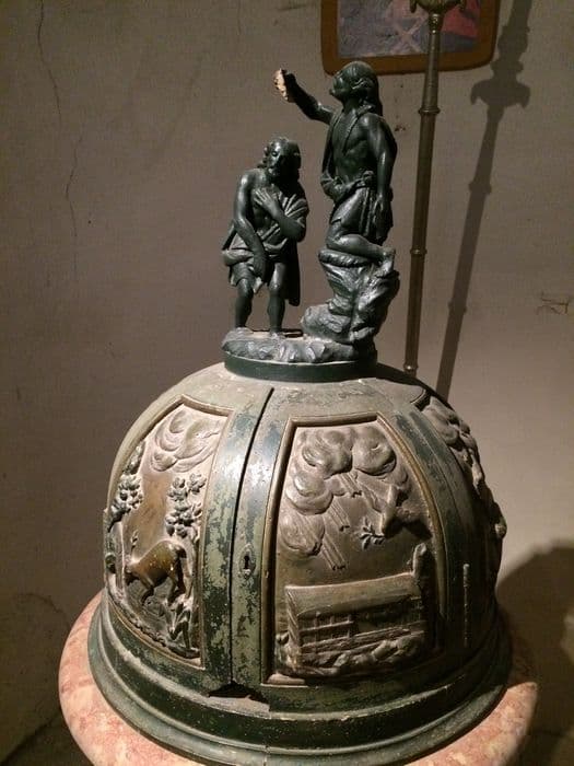 Balustre et cuve : pierre calcaire marmoréenne ; couvercle divisé en six panneaux sculptés peints, surmonté du groupe du baptême du Christ : bois polychrome et doré. Cuve sculptée de godrons. Balustre de section triangulaire avec angles coupés. Cuvette en cuivre avec couvercle en bois dans la cuve.
