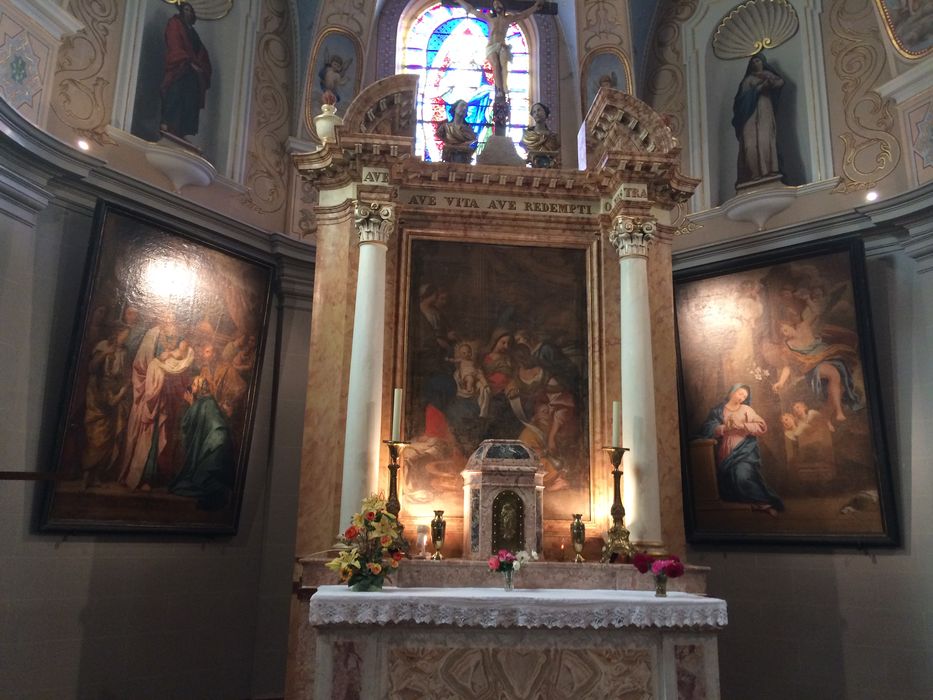 Autel majeur, tabernacle, retable et antependium, pierre marmoréenne rose veinée, jaune veiné, rouge, marbre blanc, violet, gris veiné (tabernacle) et rose veiné (tabernacle), stuc peint en faux marbre blanc et ocre (retable architecturé), bois polychrome et doré, cuivre.