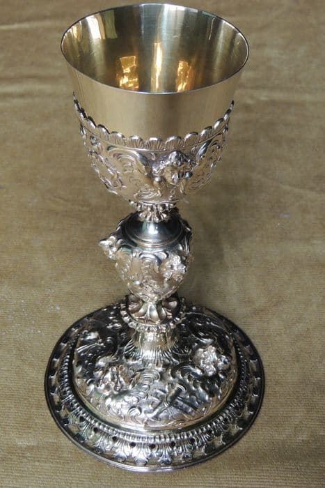 Inscription gravée sur le pourtour du pied : PIERRE.DE.LA.PORTE.1640. Sur le pied, poinçon de jurande Q couronné avec un point : Paris 1637 et poinçon du maître orfèvre Pierre Legras, reçu en 1636 : lettres PLG.