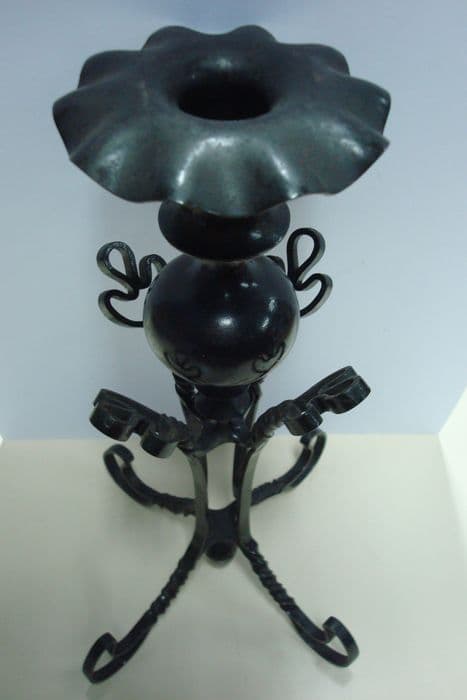 Le corps du chandelier, constitué d'une partie sphérique prolongée par une partie cylindrique, se termine en collerette et repose sur quatre pieds torsadés.