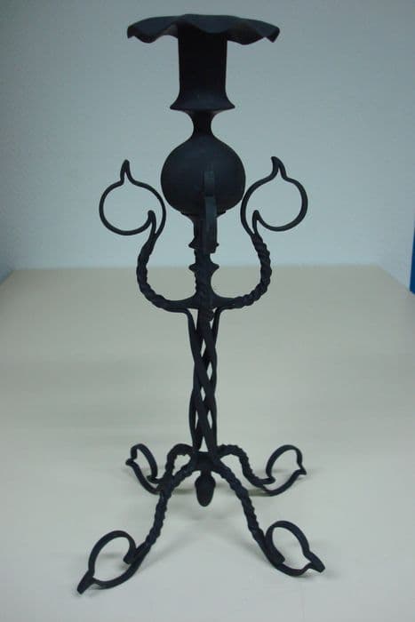 Le corps du chandelier, constitué d'une partie sphérique prolongée par une partie cylindrique, se termine en collerette et repose sur quatre pieds torsadés.