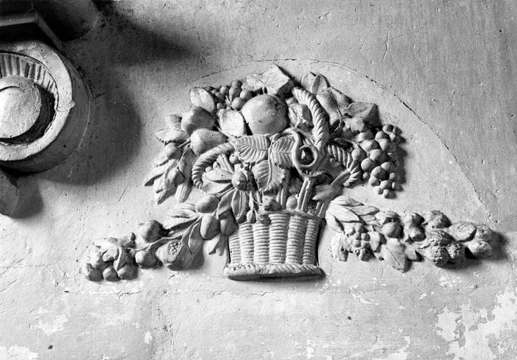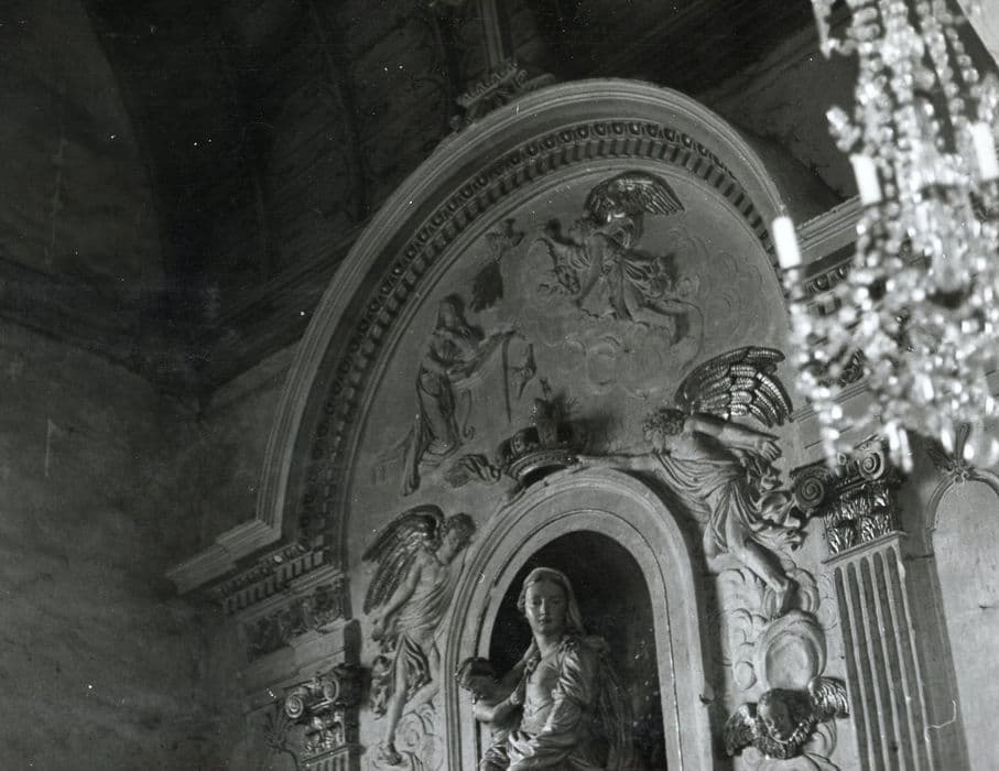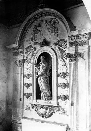 Niche centrale à cadre mouluré, sur une console sculptée. Contient une statue de la Vierge à l'Enfant, en terre cuite. Partie centrale : encadrée par deux pilastres cannelés à chapiteaux composites, et, vers l'extérieur, deux panneaux avec tablette étroite surmontée d'une palmette. Sous l'arc en demi-cercle du couronnement supérieur du retable, bas-relief qui représente l'Annonciation.