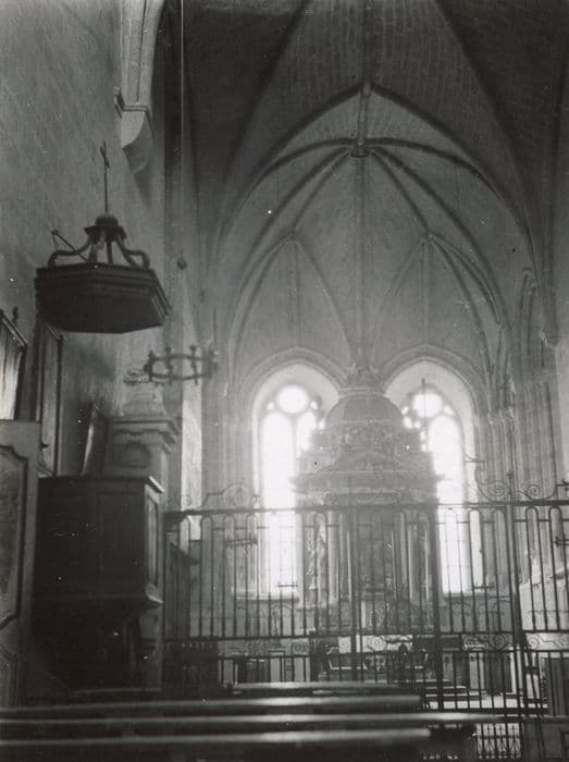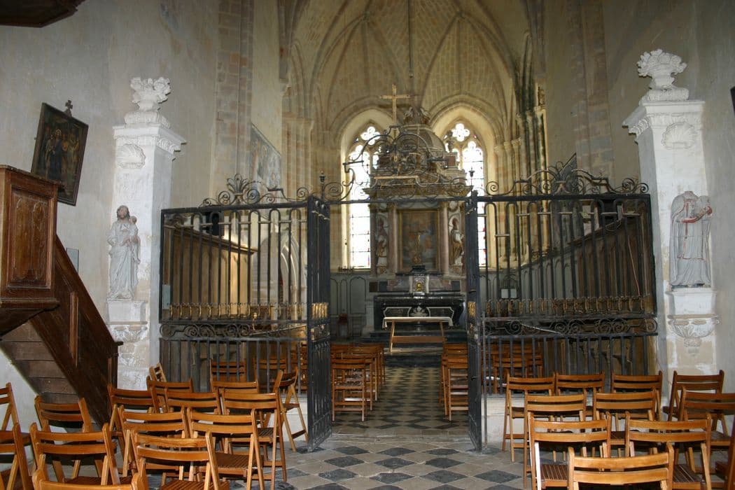 Sépare le choeur de la nef. Est disposée selon un tracé rectiligne, entre deux massifs de pierre décorés. Au centre : porte à deux battants ; de part et d'autre de la porte, la base de la grille repose sur un muret ; dans le sens de la hauteur, la grille comporte deux registres séparés par une bande de volutes affrontées. Partie supérieure : porte trois groupes de volutes de plus grandes dimensions que les précédentes ; celles des parties latérales s'appuient au milieu sur une fleur de lys ; celles qui surmontent la porte la porte sont sommées d'une croix.