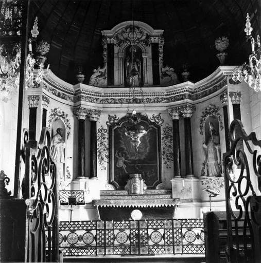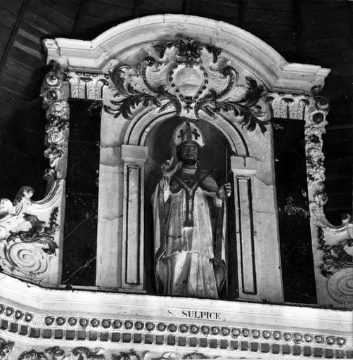 retable du maître-autel, gradins d'autel, tabernacle, tableau : La Résurrection du Christ, statues : Saint François de Sales, Saint Augustin, Saint Sulpice
