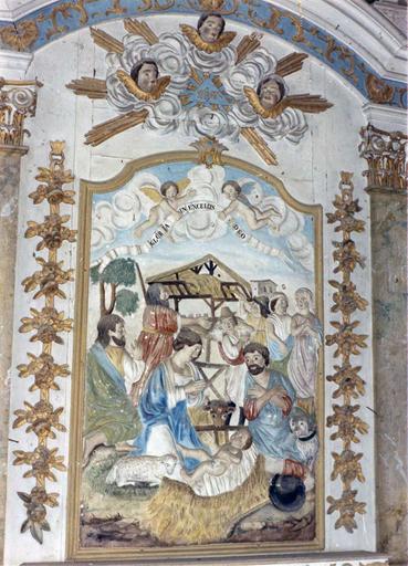 Partie centrale : encadrée par deux pilastres avec chapiteaux composites ; comporte un haut-relief représentant l'Adoration des Bergers. Parties latérales : constituées par deux panneaux de bois formés de planches disposées verticalement ; devant les panneaux, deux statues en terre cuite, chacune composée de trois morceaux, reposent sur des socles : à gauche, la Vierge à l'Enfant, à droite, saint Nicolas. Couronnement : entablement avec arc au-dessus de la partie centrale.