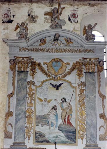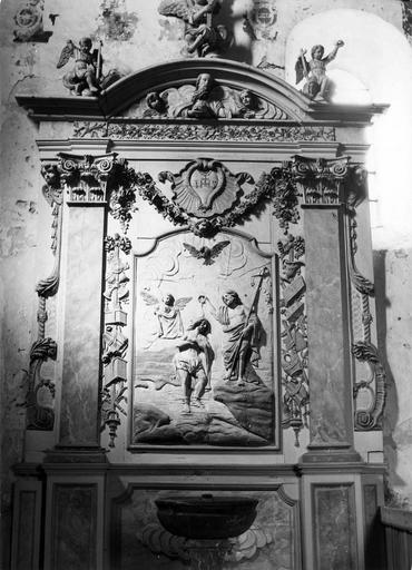Partie inférieure : comporte un bas-relief en terre cuite représentant le Baptême du Christ ; de part et d'autre, deux pilastres surmontés de chapiteaux composites. Partie supérieure : au-dessus de l'entablement, un arc surbaissé se raccorde avec les parties horizontales du couronnement aux extrémités latérales.