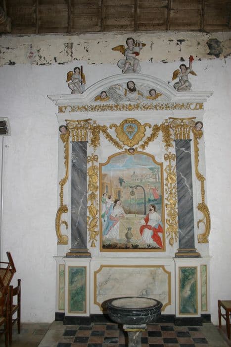 Partie inférieure : dans un cadre, un bas-relief représentant le Christ et la Samaritaine ; de part et d'autre, mêmes pilastres et même décor latéral que le retable nord de la nef. Partie supérieure : même structure également.