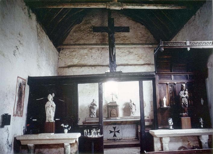 Au centre, une ouverture servant de passage est bordée par deux montants verticaux. De chaque côté de ceux-ci, un panneau occupe la partie inférieure, celui de droite étant plus étroit que celui de gauche. A gauche, les panneaux sont complets ; ils présentent trois étages de tablettes. A droite, les panneaux, disposés verticalement, sont surmontés d'un dais, soutenu par des pièces de bois arquées, et bordé d'une petite balustrade. Reposant sur la corniche, au-dessus du passage central, se trouve un Christ en croix, dont les bras sont rapportés. Certaines parties ont été refaites.