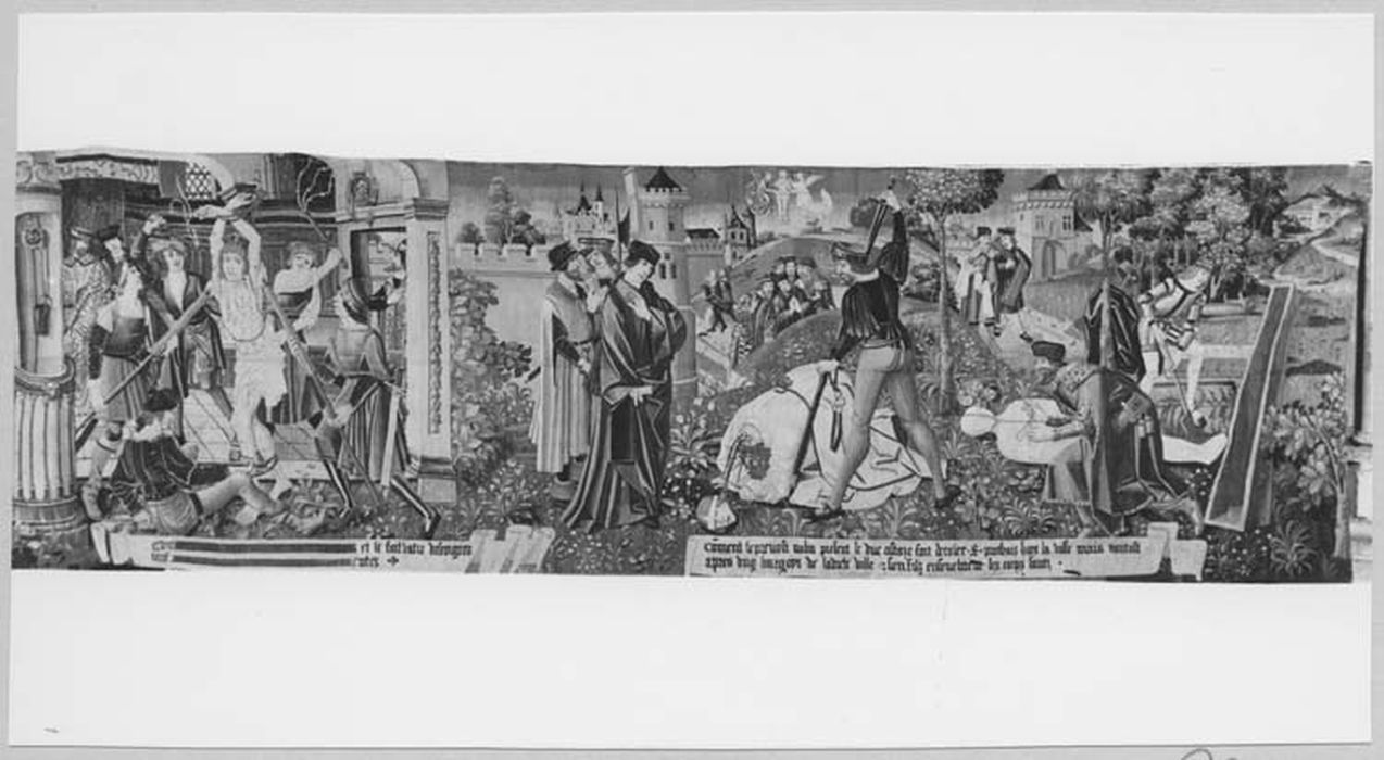 Inscription concernant l'iconographie (incomplète) : Côment Vital à cause de ladite exortacio par le commadement de ... fut tué en travail et depuis enfouy tout vif par le cosseil du prètre des ydoles lequel le dyable emporta visiblement (1ère scène). Inscription concernant l'iconographie : Comment Balras après le trespas de son mary Vital pour le quelle ne voulait adorer les ydolles fut par aucuns payens tant batue quils la cuiderent morte puis fut portée à Millan et la rendit son ame a Dieu (2e scène). Inscription concernant l'iconographie : Comment St-Gervais et St-Prothais après le trespas de leur père et mère livrerent tout leurs biês et en reçurent les deniers lesqls ils donêret aux pauvres puis se revestirent de robes blâches (3e scène). Inscription concernant l'iconographie (incomplète) : Coment St-Gervais et St-Prothais ptiret de la cité ... en la compagnie de Nazare et de l'enfant Celse pour ... à Millan et la ils furent baptisez p levesque du lieu (4e scène). Inscription concernant l'iconographie : Coment St-Gervais et St-Prothais tirèrent le diable hors du corps dûe jeune fille laquelle tantost après fut par eux baptisée avecques son père (5e scène). Inscription concernant l'iconographie : Coment St-Nazare acompaigne de St-Gervais et St-Prothais ediffierent une chapelle en un boys et l'enfant Celse leur administrait les pieres (6e scène). Inscription concernant l'iconographie : Coment Neron de ce adverty envoia Dento et Paulin acompagnez de gens d'armes pour les prendre et les luy amener (7e scène). Inscription concernant l'iconographie : Comment St-Gervais et St-Prothais acompaignez de St-Nazare et de Celse furent amenez devant lempereur Neron pour estre de luy interroges (8e scène). Inscription concernant l'iconographie : Coment la fouldre tomba sur ledit Neron et luy rédit le visaige noir et obscur et la face desdits saincts martirs resplendissoit comme le soleil (9e scène). Inscription concernant l'iconographie : Coment Neron promist faire grand biens à St-Gervais et St-Prothais pour delaisser la foy ce qu'ils refuserent endisant q les bns et honeurs mondains nestoient que fiens et pourritures (10e scène). Inscription concernant l'iconographie : Coment Neron de rechef fist metre en prison lesdiz St-Gervais et St-Prothais (11e scène). Inscription concernant l'iconographie : Coment Dieu evoia ung ange reconforter les d'sais en les exhortant quils tenssent fermes en la foy et q Neron seroit par eulx confondu (12e scène). Inscription concernant l'iconographie : Coment St-Gervais et St-Prothais par le commandement de Neron furent menez a Nolin prevost de Millan pour les executer lèql tantost les fist mett'en prison (13e scène). Inscription concernant l'iconographie (incomplète) : Coment ... et le fait batre descorgeeis tout ... entez (14e scène). Inscription concernant l'iconographie : Coment le prevost Nolin present le duc Altaze fait decoler St-Prothais hors la ville mais tautost après ung burgoys de ladicte ville et son fils ensevelirent les corps saints (15e scène). Inscription concernant l'iconographie : Coment après leurs corps furent portez dedans l'église ung aveugle et plusieurs malades furent gueris présent saint Anbroise et plusers autres prelats (16e scène). Inscription (latin) : ora pro me sancte martine (17e scène, sur une banderole). Inscription (incomplète, latin) : anno dni millesimo quingentesimo nono magister Martinus Guerande presbiter, natione andegavus, Cenomanen ecclesie canonicus. revere... morium que patrum illustri prosapia natorum dominorum philippi Cardinalis de Lucemburgo nuper necnon Francisi de Lucemburgo cuis nepotis moderni episcoporû Cenomansi secretarius donavit eid ecclesie cenomancûm hanc tapiceriom pro ornatu chori ad laudem dei beatorum que martirum Gervasii atque Prothasii ac tocius curie celestis eidem donator pascat deus amen (17e scène, dans le bas).