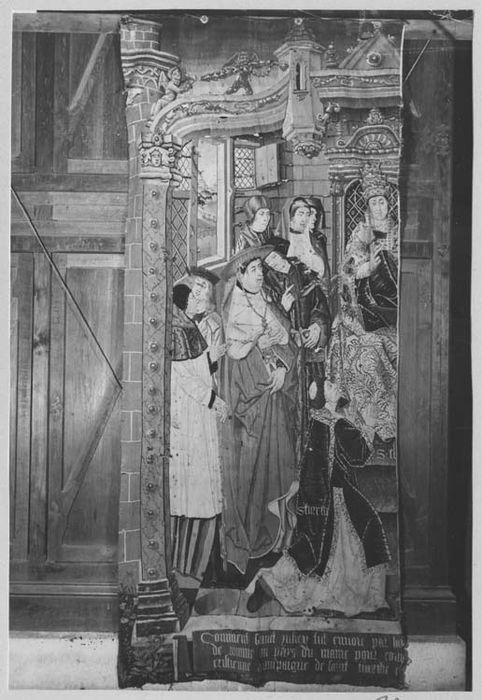 Inv. 1972, n°2, 4e panneau. Reproduit la moitié gauche de la 1ère scène du 1er panneau de la tenture dite de la Grande Série de saint Julien, classée le 6 juin 1902, mais elle en diffère par des détails importants.