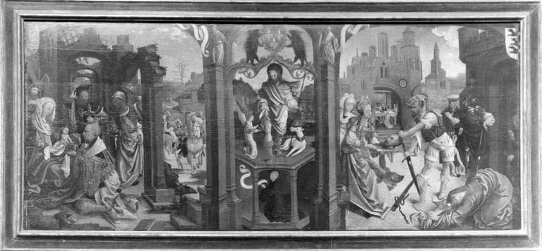 Ex-voto constitué de deux panneaux peints représentant l'Adoration des Bergers, et la Présentation au Temple, pour un panneau, et l'Adoration des Mages, saint Roch découvrant sa plaie, et la décollation de saint Jean-Baptiste, pour l'autre.