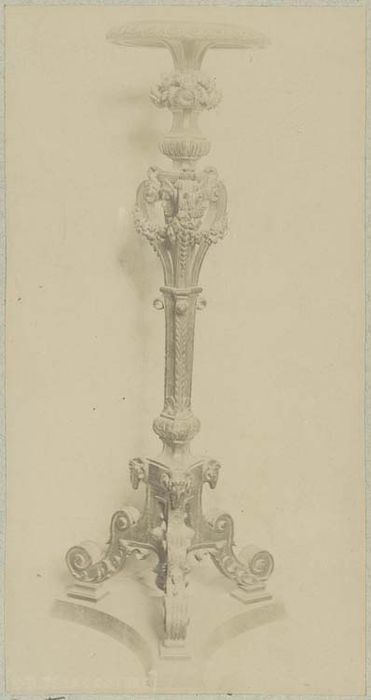 Le pied de chaque torchère est de forme triangulaire, et est décoré de têtes de béliers.
