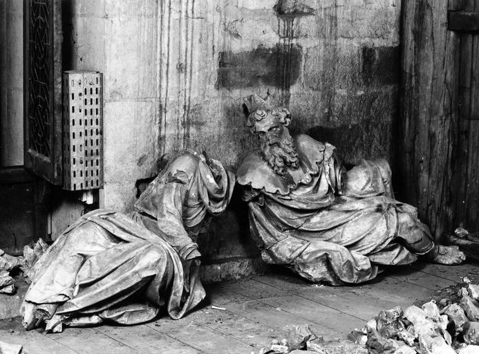Statues de rampants représentant un roi couronné (le roi David ?), et une figure sans tête.