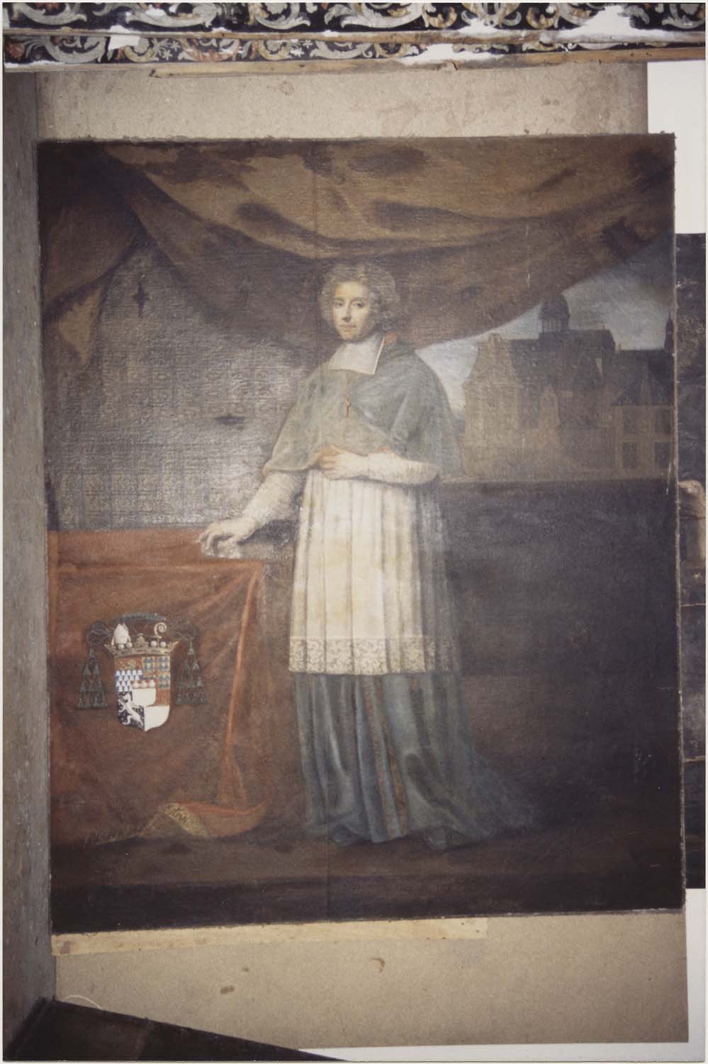 Armoiries : (peintes, à gauche du tableau, sur la draperie retombant de la toile). Inscription (partiellement illisible) : Montenard (?) (face antérieure de la marche de l'estrade). Date (partiellement illisible) : 168? (face antérieure de la marche de l'estrade).
