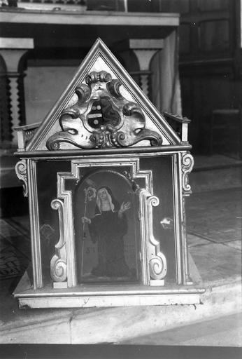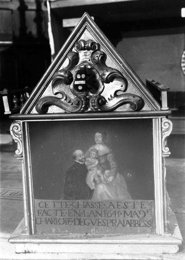 Inscription donnant l'identité du modèle : BENO/IES, IULIEN, PAVACE, ROUMAIN (noms peints sur la face antérieure de la châsse, à droite). Inscription donnant l'identité du modèle : ST AGDE NET TE (face latérale droite, au niveau des genoux de sainte Ad (e) nette). Armoiries : écusson armorié (sur le fronton triangulaire de l'édicule). Date : 1645 (au-dessous du cadre rectangulaire de la face latérale gauche). Inscription concernant le donateur : CETTE CHASSE AESTE FACTE EN L'AN 1645 MADE CHARLOTTE DEGUES PRAI ABBESSE (au-dessous du cadre rectangulaire de la face latérale gauche). Armoiries : écusson armorié (face latérale gauche).