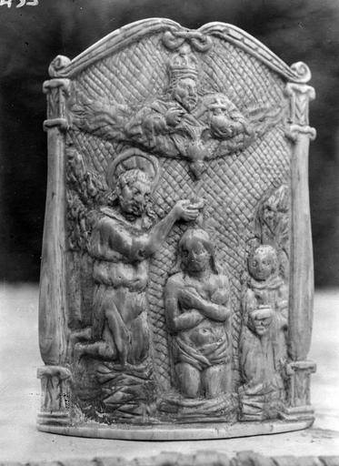 L'objet a la forme d'un rectangle convexe à surface cylindrique, plus haut que large. L'ivoire est pris dans la partie creuse d'une dent d'éléphant. Un anneau est fixé par derrière, dans une rainure de la surface concave. La sculpture en relief représente le Baptême du Christ.
