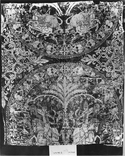 Le suaire consiste en deux morceaux de soie brodée (étoffe sassanide ou byzantine), se raccordant exactement. Le fond est bleu pâle, et les dessins sont de couleur jaune, vert clair, vert foncé, et violet pâle.
