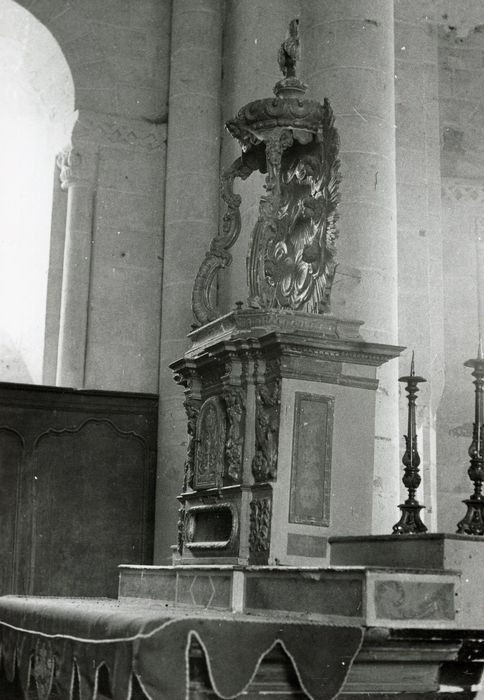Tabernacle : le soubassement comporte un coffret à reliques. L'exposition est posée sur le tabernacle ; elle est dotée d'un socle à cinq faces.