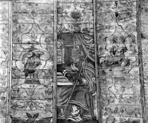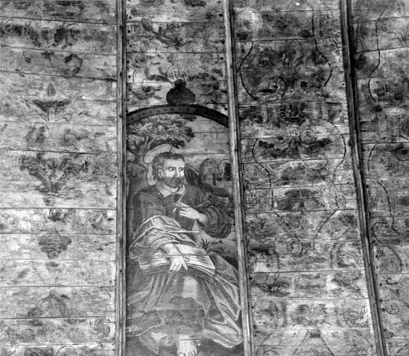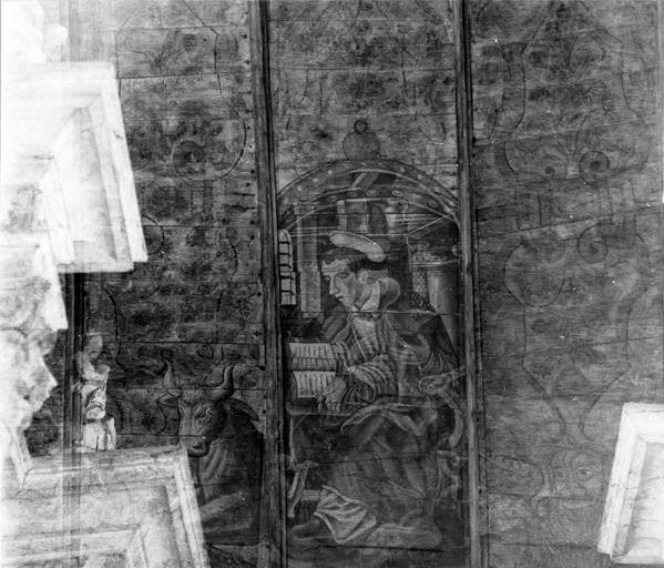 peintures : Les Quatre évangélistes, Saint Ambroise, Saint Pape, Saint Augustin et saint Jérôme avec des rinceaux de feuillages