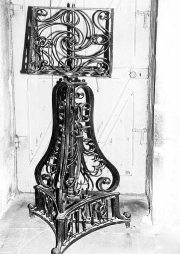 Le socle s'inscrit dans un triangle curviligne. Le pied, qui enveloppe le montant vertical, épouse transversalement la même forme que le socle. Chacune des trois arêtes présente une longue concavité se prolongeant en haut et en bas par une convexité qui s'achève en enroulement vers l'intérieur. Le pupitre est à deux faces.