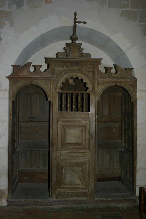Meuble placé dans une niche du mur, dont la partie supérieure est cintrée. Loge centrale : fermée par une porte, présentant en bas, l'un au-dessus de l'autre, deus panneaux à cadre mouluré ; en haut : la loge reçoit la lumière par une ouverture rectangulaire munie de cinq fuseaux, et, au-dessus, par une ouverture en demi-cercle avec fuseaux disposés selon les rayons. Chacune des deux loges latérales a une ouverture cintrée à la partie supérieure ; elle est surmontée du rampant d'un fronton triangulaire coupé. Entre le rampant et la partie centrale du meuble, un petit socle est situé entre deux courbes concaves, celle qui est du côté intérieur se prolongeant vers le haut par un enroulement. Un autre petit socle est fixé sur le rampant. Reposant sur la partie supérieure du confessionnal, un socle bordé d'ailerons est sommé d'une croix.