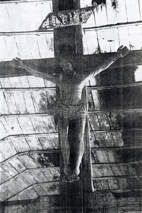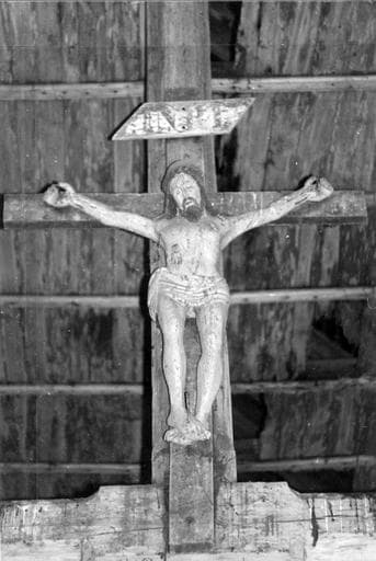 La croix est fixée au poinçon de l'entrait. Les pieds du Christ, le droit sur le gauche, sont fixés par le même clou.