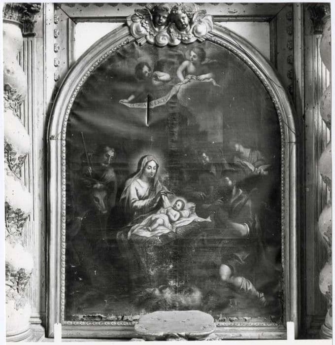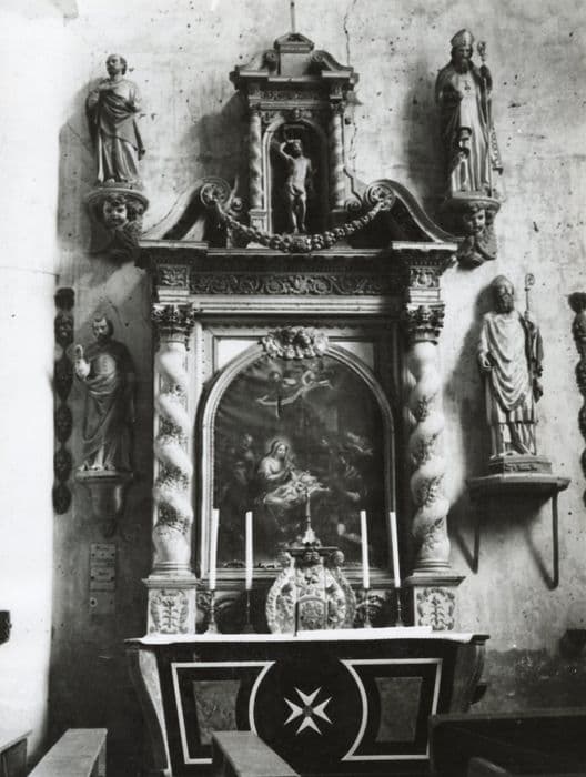 Corps principal encadré de deux pilastres et de deux colonnes torses, décorées de motifs sculptés dorés sur fond gris, avec des chapiteaux composites. Entablement décoré de rinceaux sculptés. Fronton courbe coupé, à enroulement intérieur, auquel est suspendue une guirlande de fruits et de fleurs. Niche supérieure encadrée par deux colonnes torses, portant un entablement et un fronton courbe coupé à enroulement intérieur. Tabernacle en bois à corps renflé décoré de sculptures.