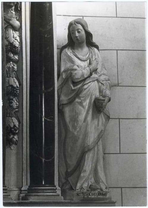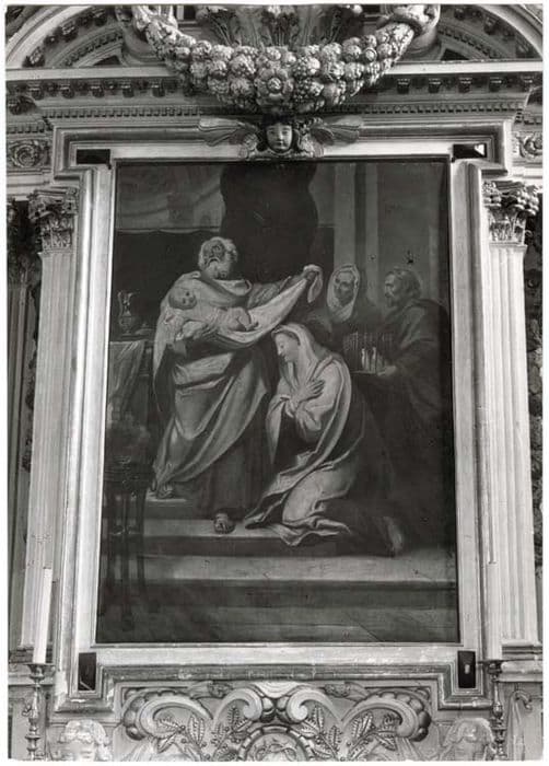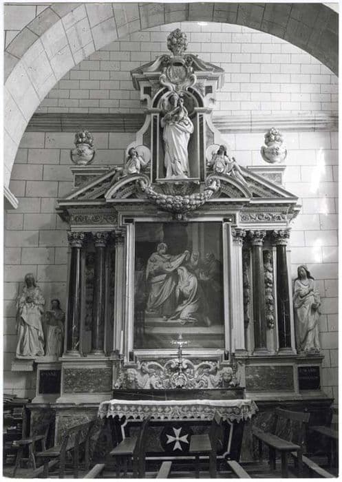 Le tableau central représenté la Présentation au Temple, surmonté d'une tête d'ange ailée et d'une guirlande de fleurs et de fruits. Des anges sont à demi allongés sur les rampants du frontons. La niche supérieure contient une statue de la Vierge à l'Enfant. De part et d'autre du retable, contre le mur, des statues de sainte Madeleine à droite, et de l'Education de la Vierge à gauche. Le bandeau de pierre sous le tableau porte en son centre la couronne d'épines dans un médaillon encadré de feuillages et d'arabesques ainsi que deux têtes de chérubins aux extrémités. Au sommet du retable, un médaillon portant le monogramme de la Vierge.