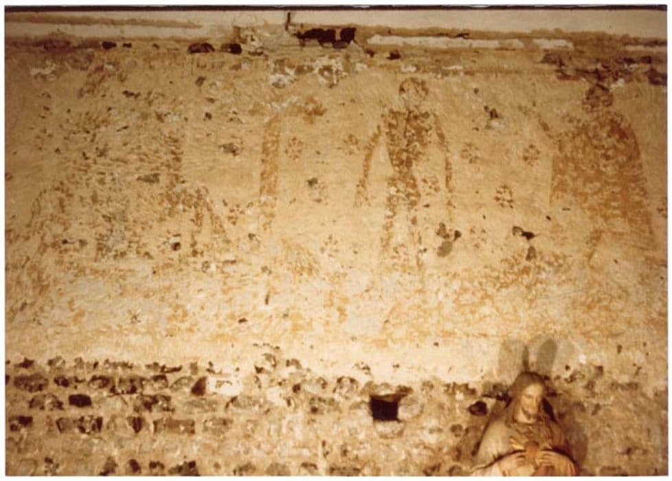 Les restes de peintures murales occupent la partie supérieure du mur où elles sont limitées par une bordure horizontale ocre.