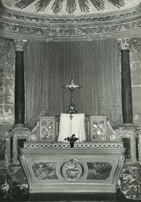 Le fond du retable a une forme courbe se rapprochant du grand côté d'une ellipse. Quatre colonnes de marbre à chapiteaux corinthiens (marbre rose au fond, noir en avant) soutiennent une demi-coupole. Aux extrémités latérales du retable les colonnes reposent sur des socles indépendants