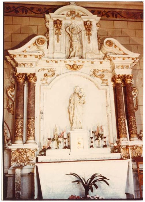 Deux retables de composition identique. Corps central avec cadre mouluré dont la partie supérieure est en forme d'arc. Le cadre du retable de la Vierge comporte un tableau. Corps central encadré de chaque côté par deux colonnes cannelées portant des chapiteaux corinthiens et dont la partie inférieure du fût est agrémentée de vigne dorée. Les parties latérales sont bordées d'un aileron à enroulement vers le haut, décoré de draperies. L'entablement présente deux avancées au niveau des colonnes. Il est surmonté par deux rampants aux extrémités, en forme d'enroulements. Au centre, une niche à pilastres et au fronton en arc de cercle contient une statue.
