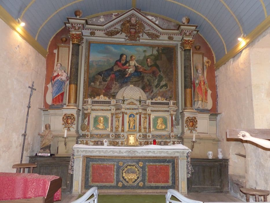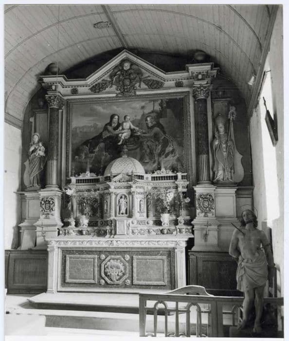 Retable dont la partie centrale est occupée par un tableau de grandes dimensions, encadré par deux colonnes peintes en faux marbre et portant des chapiteaux composites. Ces chapiteaux supportent un court entablement, en retrait au niveau du cadre, surmonté d'une corniche à denticules formant un fronton triangulaire sculpté en partie centrale. Au sommet, deux boules aux extrémités. Sur les parties latérales du retable, deux statues en terre cuite devant un pilastre sommé d'une boule. Soubassement constitué de panneaux moulurés peints en imitation pierre, comportant des blasons sous les colonnes. Tabernacle architectural dont la partie centrale comporte trois faces. La porte et les deux faces en retour prennent la forme de niches abritant des statuettes en bois doré, bordées par des colonnes soutenant un entablement sculpté pourvu d'une rangée de denticules et de corbeaux. Les panneaux latéraux sont ornés de bas-reliefs. Au-dessus de l'entablement, au centre, un fronton triangulaire et deux pots à feu. Au sommet, une balustrade sur toute la longue du tabernacle, un dôme à écailles sommé d'un vase en partie centrale et des obélisques et des pots à feu sur les parties latérales.