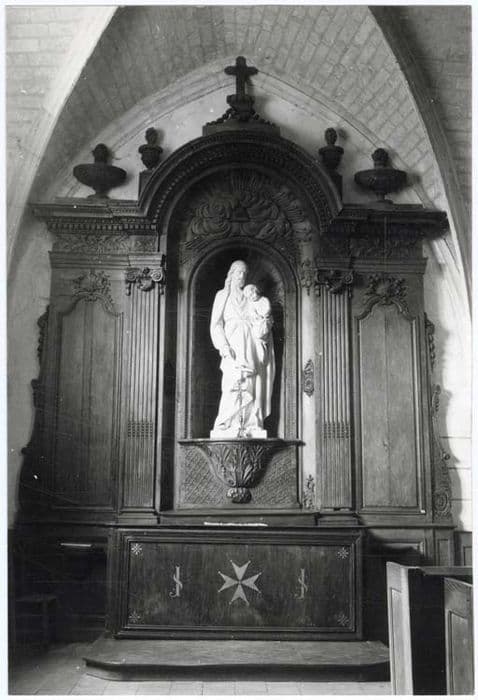 Retable du bas-côté nord de la nef, côté est. Partie centrale entre deux colonnes cannelées à chapiteaux ioniques portant des guirlandes. Elle contient une niche ornée d'un coquille reposant sur une console ornée de feuillages avec de part et d'autre un décor réticulé. Les parties latérales comportent un panneau allongé dans le sens de la hauteur à bords moulurés et dont la partie supérieure, formée d'éléments courbes est sommée d'une coquille. Le bord extérieur de la partie latérale comporte en bas un aileron étroit avec enroulements et crochets, en haut, une petite chute de feuilles. En partie supérieure, un arc surmontant la partie centrale se raccorde aux parties horizontales de l'entablement. Sous une rangée d'oves et de denticules, des rinceaux de feuillages stylisés ornent le bandeau au-dessus des parties latérales. L'arc est sommé d'une croix reposant sur un socle d'où partent obliquement deux petites chutes. Deux pots à feu sont posés sur des socles aux retombées de l'arc. Un pot à feu plus large surmonte la partie horizontale de l'entablement.