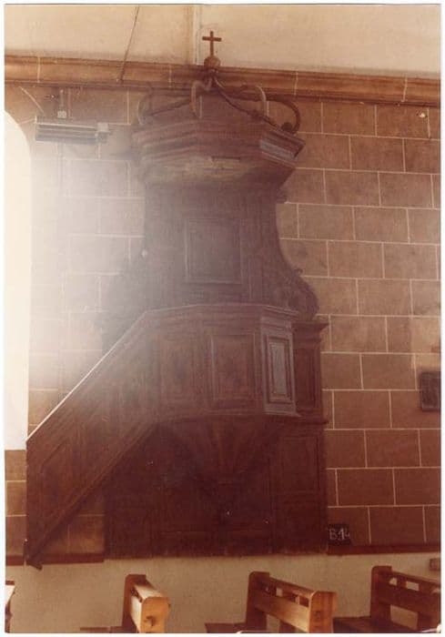 Cuve à quatre faces avec des panneaux rectangulaires moulurés. Pendentif à sept faces visibles dont la surface est concave, s'achevant par un gros gland. Dossier pourvu d'un panneau rectangulaire mouluré flanqué de deux ailerons à volutes et crochets ornés en bas de feuillages et de fleurs. Abat-voix à cinq faces surmonté de six éléments courbes se rejoignant au sommet et surmontés d'un globe portant une croix. Escalier à rampe droite pourvu de panneaux moulurés.