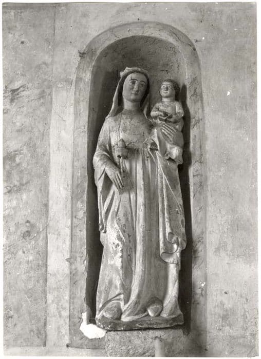 Les trois statues sont placées dans des niches, elles-mêmes encadrées par deux pilastres et un entablement peints sur le mur. La Vierge est en pierre, saint Denis en terre cuite et saint Sébastien en bois.