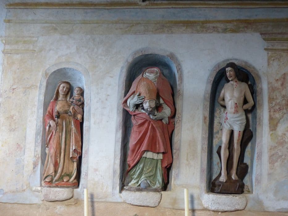 trois statues : Vierge à l'Enfant, Saint Denis et Saint Sébastien