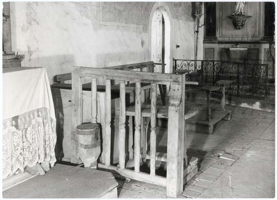 En avant du choeur une partie de l'église était fermée du côté de la nef par une balustrade en bois. De chaque côté de l'allée centrale, un panneau est constitué par un cadre de bois dont les deux traverses horizontales sont reliées par des éléments en bois tourné.